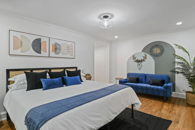 The "Bungalow Blues Bedroom" features a serene and cohesive design that blends comfort and elegance. A rich green palette dominates the space, creating a cozy yet sophisticated atmosphere, complemented by tasteful furnishings like a plush couch and a stylish vanity. The room connects seamlessly to an inviting lounge area, enhancing the flow and functionality of the layout. The adjoining master bathroom continues the calming vibe, with modern fixtures and thoughtful details that elevate the overall aesthetic. This space embodies tranquility and style, perfect for unwinding or hosting intimate moments of relaxation.